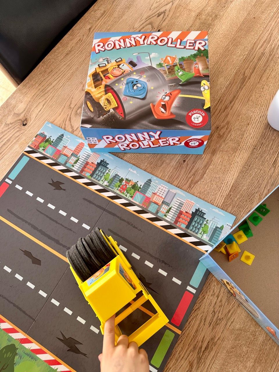 Nach dem ersten Zusammenbau einfach aus dem Karton geholt, habt ihr mit Ronny Roller von Piatnik ein neues Spiel, das einen schnellen Aufbau und kurze Spielrunden verspricht. Ziel des Spiels ist es, seine vier Verkehrshütchen sicher über die Fahrbahnen ins Ziel zu bringen. Doch aufgepasst: RONNY ROLLER nimmt bei seinen Bauarbeiten alles mit, was sich ihm und seiner Walze in den Weg stellt. Ein Spiel, was vor allem kleinen Fahrzeugfans viel Spaß verspricht und sich auch toll eignet, um Spielekritiker von Brettspielen zu überzeugen ;-).