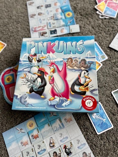 Pinkuins ist ein buntes Familienspiel für bis zu 4 Spieler, das auch zu zweit hervorragend funktioniert. Jeder verwandelt seine eigene Legetafel nach und nach in eine lustige Pinguinwelt. Mit Handkarten sichert man sich Plättchen und ordnet sie möglichst punktreich an – am Ende zählen nur verbundene Plättchen.