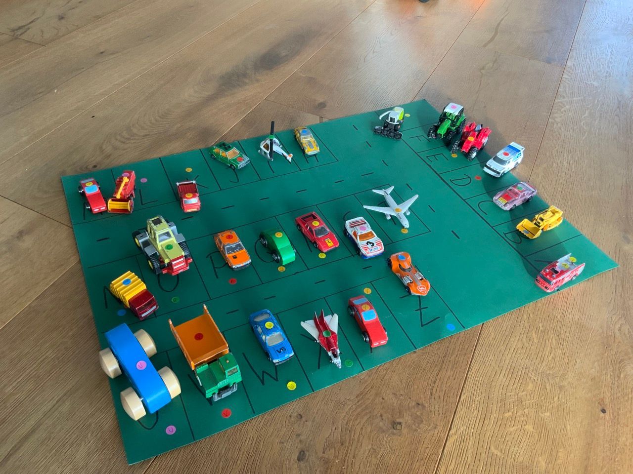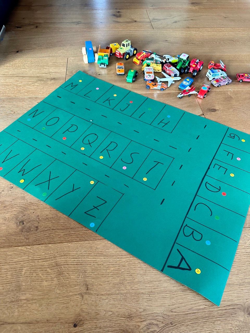 Für das Parkspiel die Pappe mit 26 Parkbuchten bemalen und mit Buchstaben beschriften. 26 Autos mit Klebepunkten von A-Z versehen und die Punkte auch auf die jeweilige Parkbucht kleben (ist einfach nochmal besser zuzuordnen). Für die Kleineren geht es auch nur mit Farbmarkierungen und weniger Fahrzeugen.