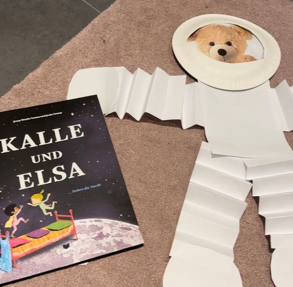 Für den Astronauten oder wie im Buch den Weltraumhund ein Loch in einen weißen umgedrehten Pappteller schneiden und das Bild eures Kindes aufkleben. Der Körper ist ein halbiertes DINA4 Blatt, die Arme und Beine zwei gefaltete und durchgeschnittene Blätter. Für Hände und Füße 4 Kreise ausschneiden und dann kann das Bemalen und Bekleben starten.