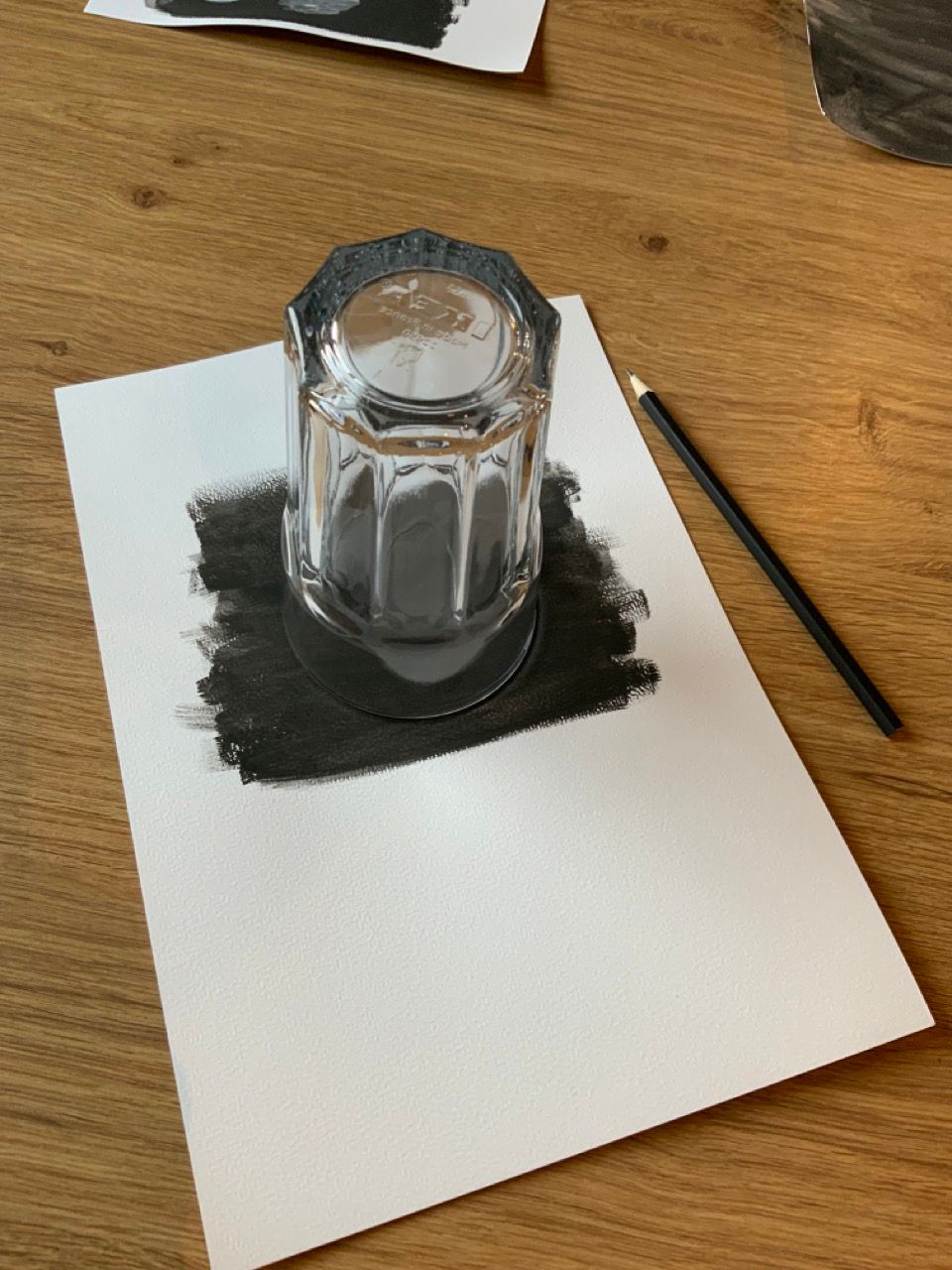 Glas, Aquarellfarben schwarz und weiß, Aquarellpapier, Wasser (alternativ ist das ganze natürlich auch mit allen anderen Farben möglich).