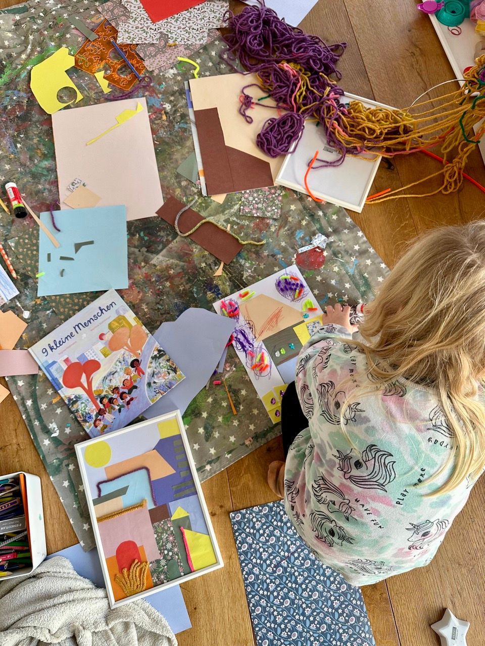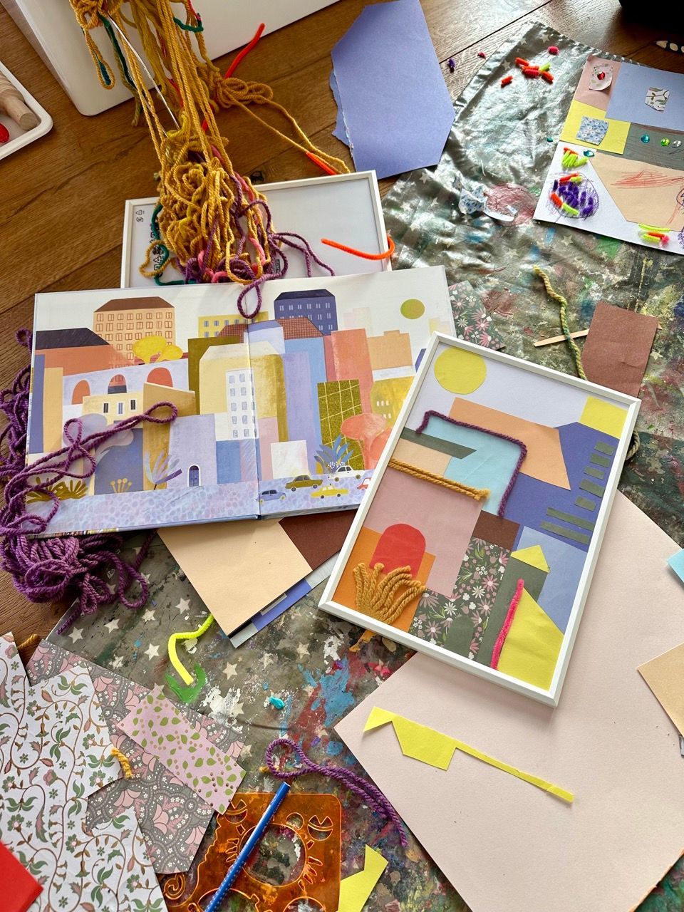 Absolute Bastelinspiration geben die tollen Illustrationen. Aus einfachen Formen ganze Städte zaubern war unser Motto und besonders eine Maus von den Zwillingsmädchen ist total kreativ geworden und hat noch andere Materialien wie Wolle, Glitzersteine und Pfeifenputzer mit in ihrer Stadt verbaut. Das ganze hängt jetzt eingerahmt im Zimmer und macht richtig was her!