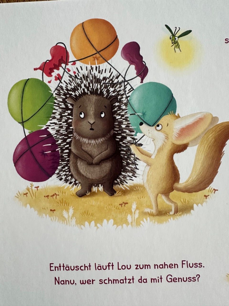 Genau das ist Lous Problem. Sie fühlt sich abends oft allein und wünscht sich ein weiches, kuscheliges Fell, damit sie sich an andere schmiegen kann. Also macht sie sich auf den Weg, um Hilfe zu finden. Der Fuchs hat eine Idee: Sechs bunte Luftballons sollen ihre Stacheln umhüllen – doch puff, einer nach dem anderen platzt! Enttäuscht zieht Lou weiter zur Maus Max, die sie in süße Zuckerwatte wickelt. Das funktioniert – bis Max doch nicht widerstehen kann und immer wieder davon nascht. Die Zuckerwatte weicht auf, tropft und klebt! Beim Versuch, sich im Fluss abzuwaschen, begegnet sie dem Flamingo, der ihr seine weichen rosa Federn anbietet. Eine traumhafte Lösung – bis der Wind kommt und die Federn einfach davonweht.