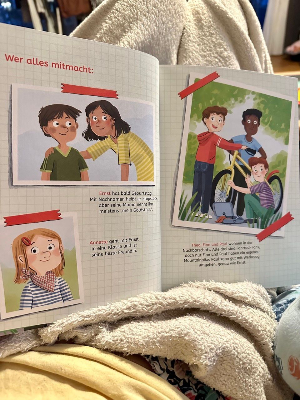 Wir haben die Geschichte über Ernst und sein verschwundenes Fahrrad gerade gemeinsam mit unserem Großen gelesen – und er hat sich regelmäßig über den Namen „Ernst Klopstock“ kaputtgelacht.
