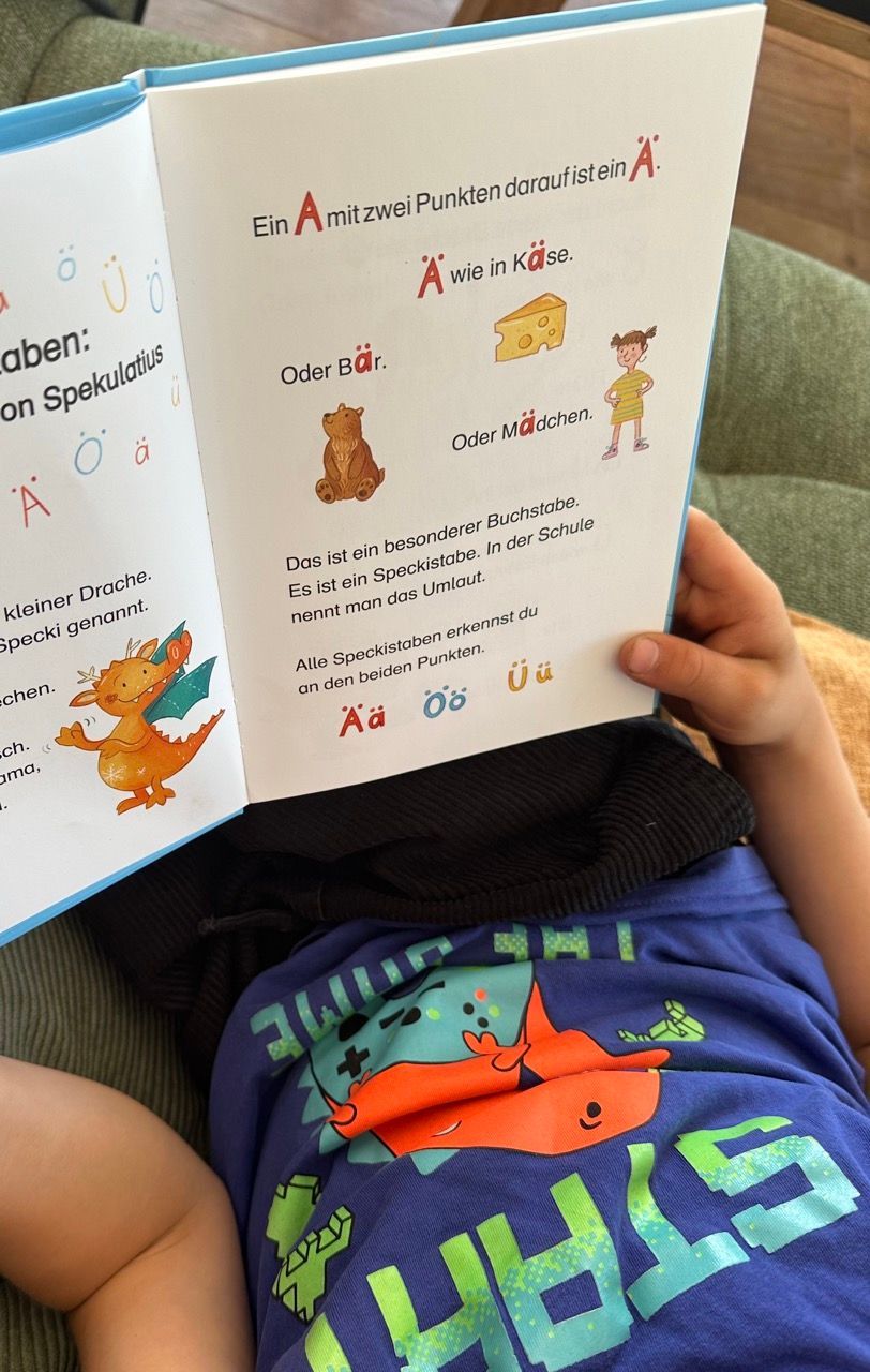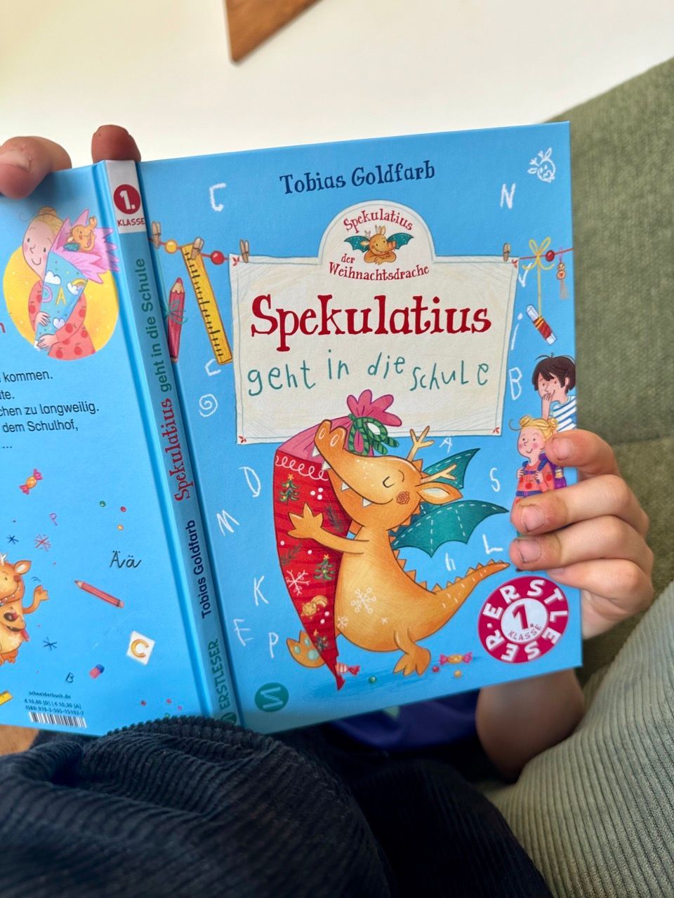 Von Spekulatius haben wir euch ja bereits schon Bücher vorgestellt und man muss den kleinen Weihnachtsdrachen einfach mögen - unsere drei tun es auf jeden Fall! Und jetzt gibt es neben den Bilder- und Vorlesebüchern auch noch ein Erstlesebuch, was jetzt für das zweite Halbjahr der ersten Klasse ideal ist. Viele wissen bestimmt, dass Spekulatius, genannt Specki, eigentlich nur zu Weihnachten zu Matilda und Maus kommt und das Familienleben ordentlich aufmischt. Seine zuckersüße Sprache, bei der a, o und u zu ä,ö und ü werden, ist für manchen Erwachsenen zwar erstmal ungewöhnlich zu lesen, aber gerade beim Lesenlernen macht es für die Kinder besonders Spass auch mal Quatschworte vorzulesen und ungewöhnliche Wörter zu üben. Die Speckistaben lockern das Vorlesen nochmal ordentlich auf.