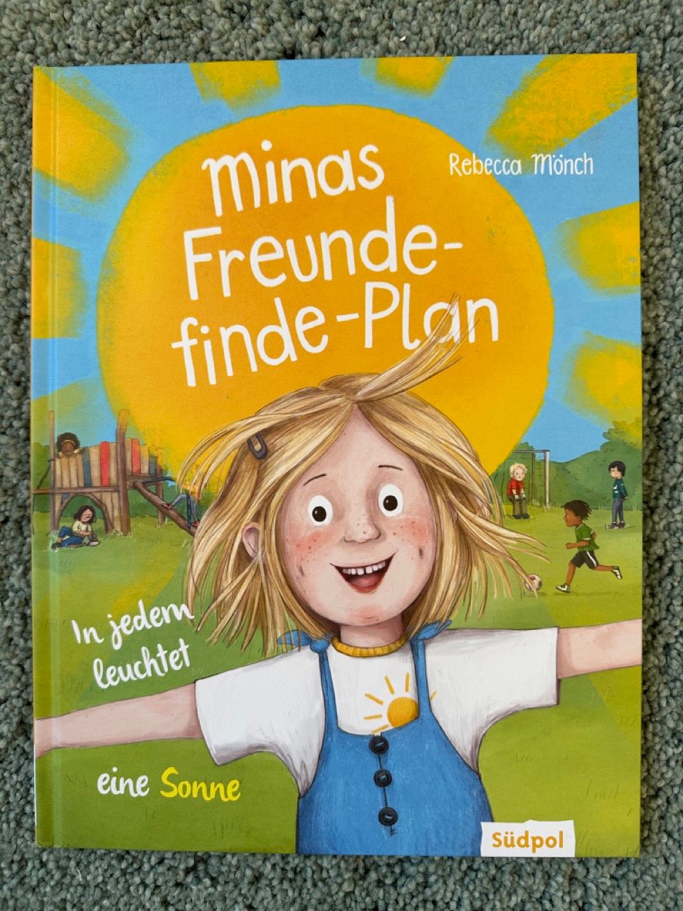 So erlebt sie spannende Nachmittage – sie klettert mit Lorenz in ein Baumhaus auf einem Bauernhof, besucht das Raketenzimmer von Valentin, lernt das trubelige Leben mit viel Besuch in der kleinen Wohnung von Elif kennen, verbringt Zeit mit Olivia und ihrer spanischsprechenden Oma und trifft sich auch mit Noah, Lotta, die sogar ein Zimmer bei Mama und eins bei ihrem Papa hat, und Mathias. Am Sonntag ist sie dann bei den Zwillingen Merle und Melian im höchsten Haus der Stadt. Am Ende der Woche fragen ihre Eltern sie, mit wem sie nun befreundet sein möchte – und Mina stellt fest, dass sie irgendwie alle mag, auch wenn sie so unterschiedlich sind. Und dann sagt ihre Mama einen Satz, über den Mina (und durch eine Fragestellung im Buch auch eure Kids) erstmal nachdenken muss: „In jedem leuchtet eine Sonne.“
