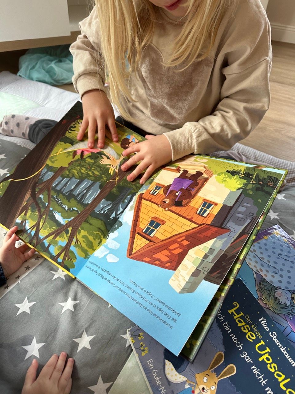 Doch damit nicht genug – als kleines Dankeschön pflücken sie sogar noch einen bunten Blumenstrauß für Bär. Als er aufwacht, ist alles blitzblank, und vor ihm steht ein wunderschöner Strauß. Sie haben ihr Versprechen gehalten – und das fühlt sich fast noch schöner an als der Apfelkuchen!