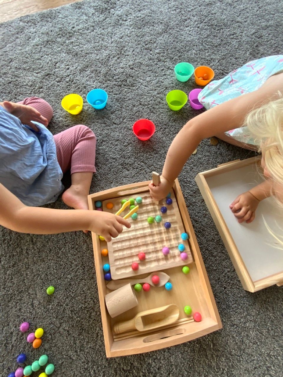Ein nachträgliches Geburtstagsgeschenk einer anderen Zwillingsmama und ein absoluter Volltreffer ist dieses Kugelsortierspiel mit den passenden Förmchen. Die Kugeln Werden auch in alle möglichen anderen Behälter sortiert. Ich habe einfach noch eine zusätzliche Zange besorgt und jetzt können auch beide gleichzeitig mit den gleichen Werkzeugen spielen ;-) Eigent sich super zum Farben lernen und zuordnen, als Eisstand.