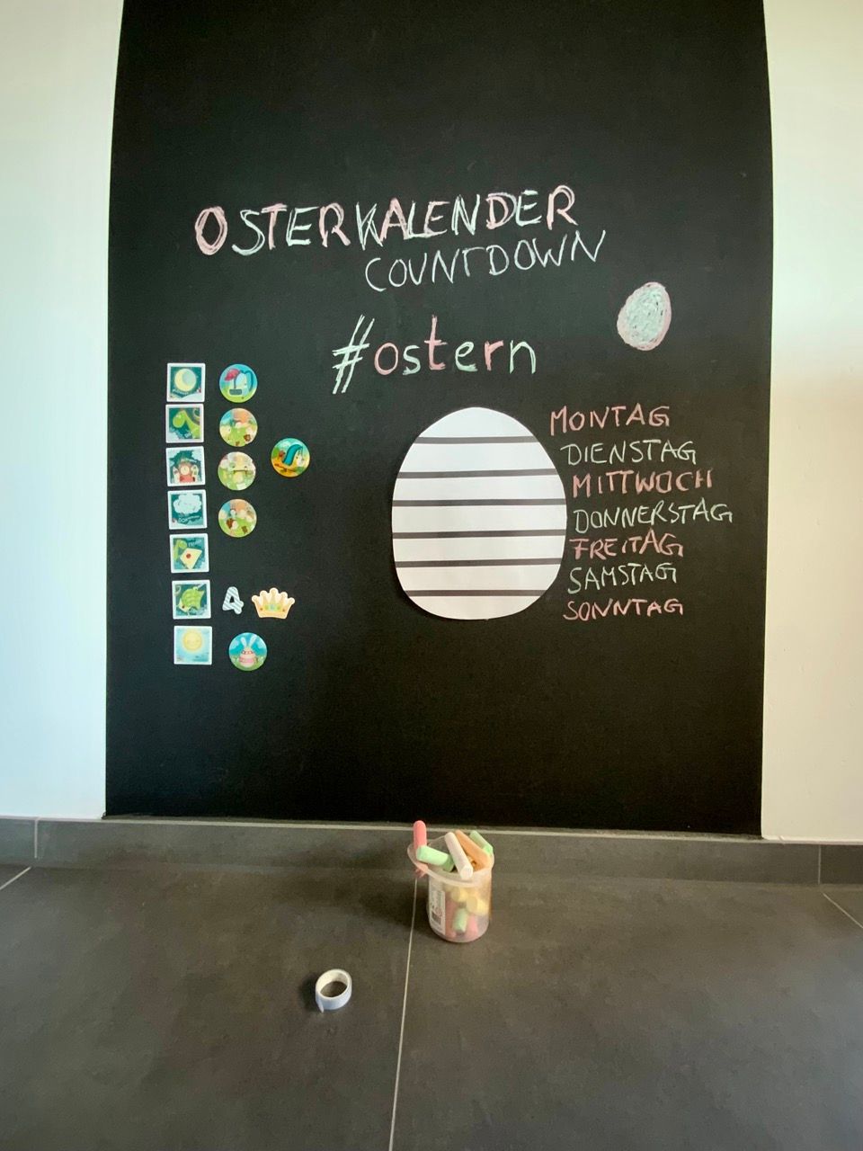Wir haben das Countdown-Ei bei uns an die Magnetwand neben den Wochenplan gehängt, das ganze geht aber genauso gut auf einem Blatt, dass ihr an die Tür hängt. Jeden Tag dürfen die Kids nun ein Streifen vom Ei ausmalen, bekleben usw. Das ganze könnt ihr auch als Variante zum Abschneiden abwandeln. So bekommen die Kids nicht nur ein besseres Zeitgefühl, sondern lernen auch, dass manche Dinge Zeit brauchen, bis sie fertig sind. Und da man eine Reihe sowohl langsam als auch schnell gestalten kann, werden auch die nicht so bastelfreudigen Kinder auf ihre Kosten kommen.