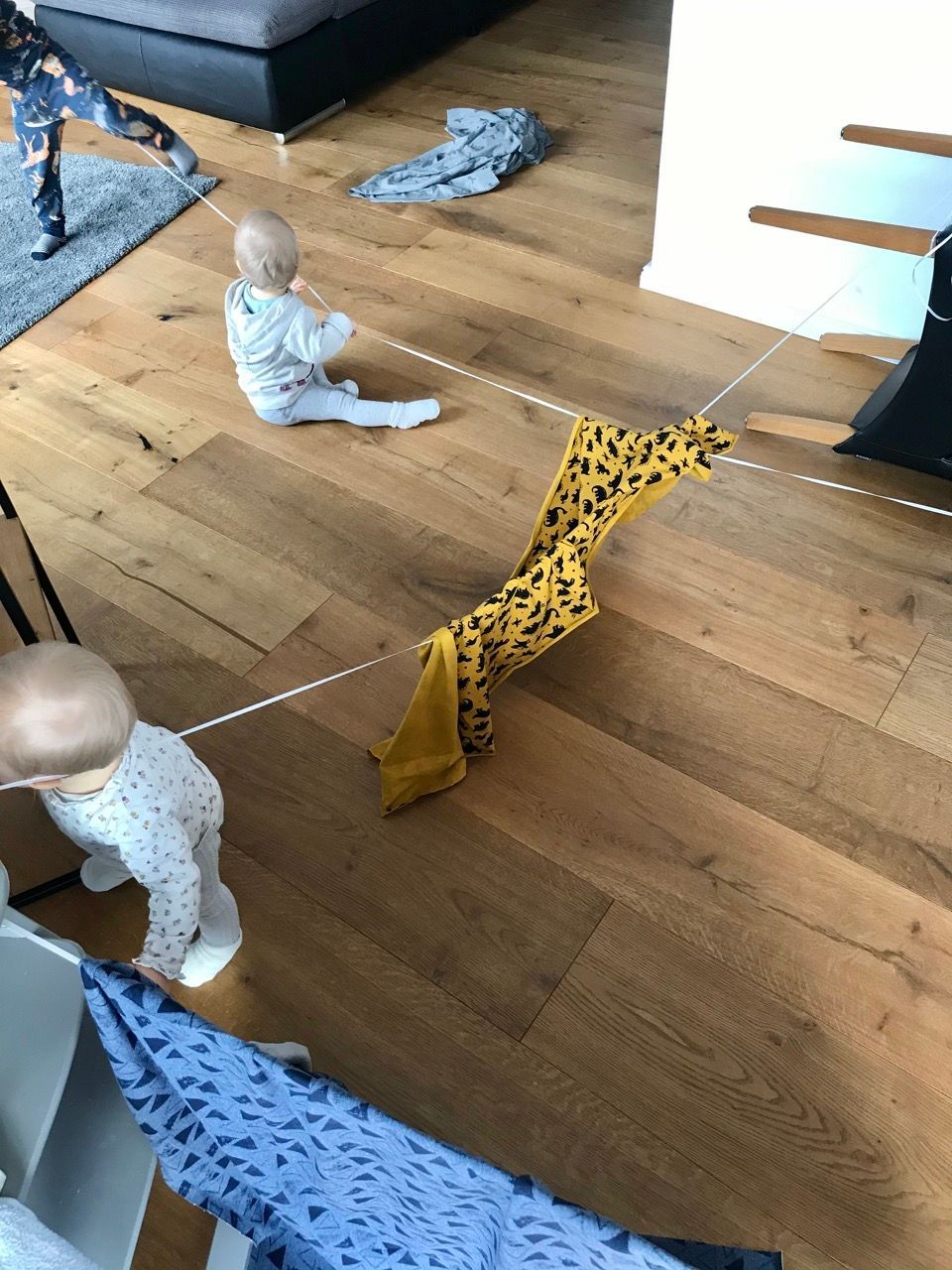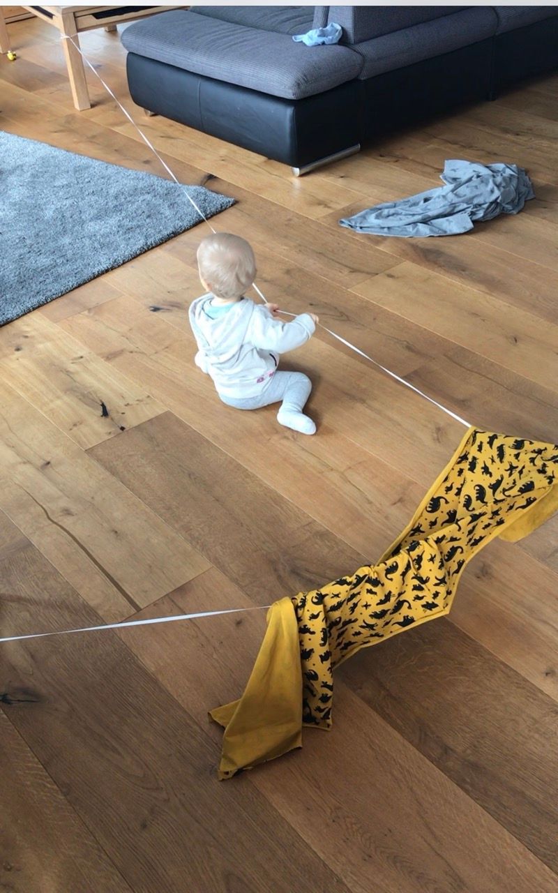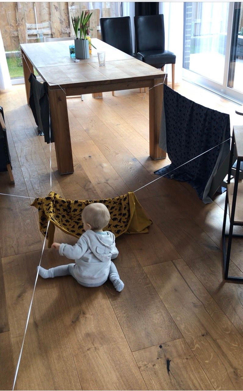 Dazu einfach Bänder an Tischbeinen oder festen Gegenständen, die nicht umkippen können, befestigen, Decken oder Stoffe rüberhängen und schon kann der Spass starten. Unsere fanden es super an den Bändern zu wackeln, und sich hinter den Stoffen zu verstecken.