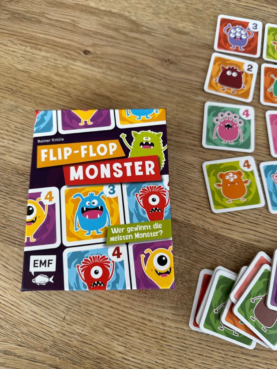 Das Spielmaterial ist liebevoll gestaltet: Die Monster sind witzig und bunt, was besonderes unseren Großen sofort angesprochen hat. Die kleine, kompakte Verpackung macht Flip-Flop Monster außerdem zu einem idealen Begleiter für unterwegs, sei es im Urlaub, auf Familienbesuchen oder als schnelle Beschäftigung zwischendurch. Durch die kurzen Runden bleibt die Aufmerksamkeit hoch, und die Möglichkeit, bei den Mitspielern nach neuen Gruppen zu suchen, macht das Spiel auch in kleineren Runden abwechslungsreich.