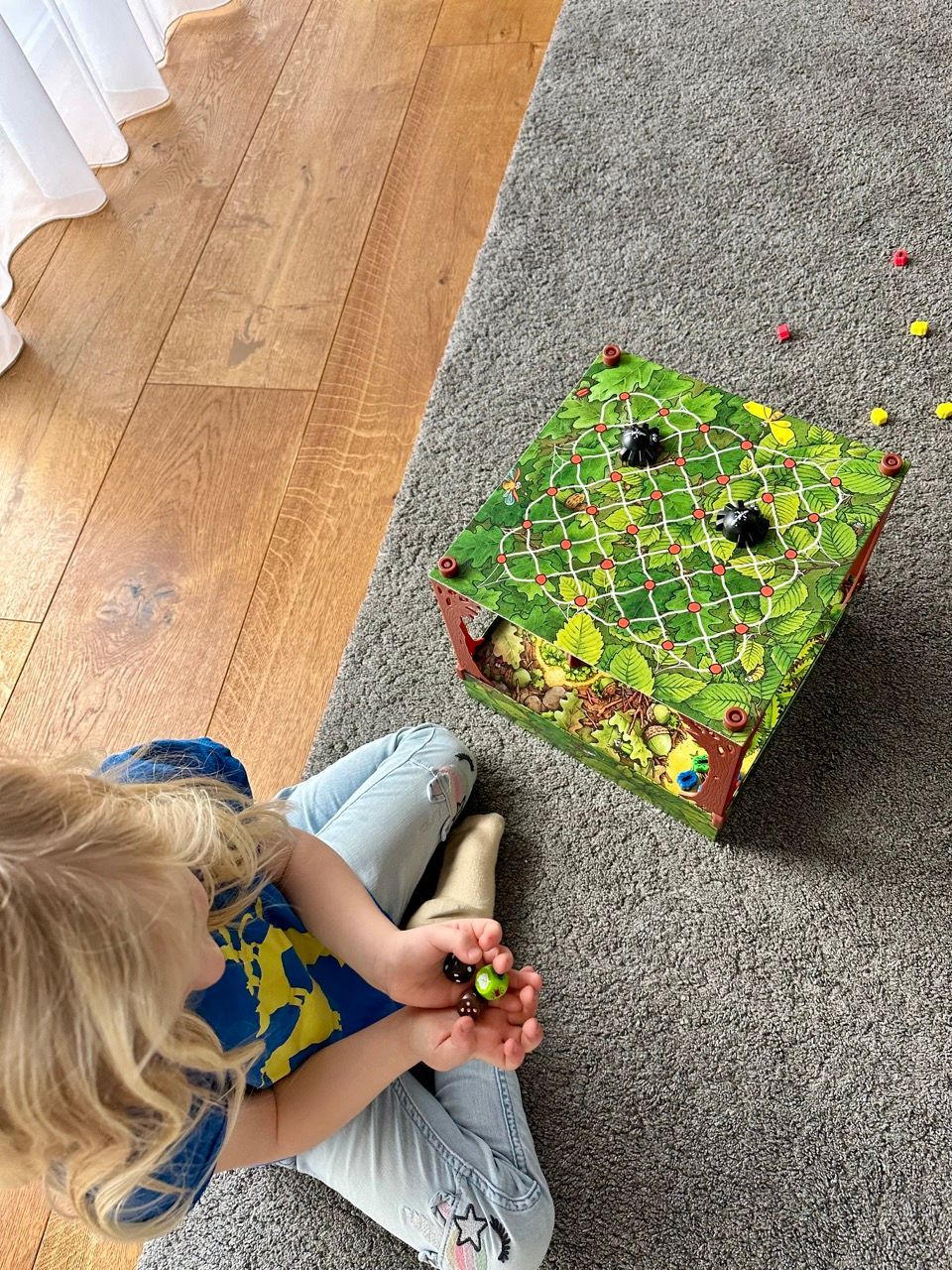 „Spinderella“, das Kinderspiel des Jahres 2015, begeistert nicht nur Kinder, sondern auch uns Erwachsenen am Tisch – und das mit gutem Grund. Es verbindet ein einzigartiges 3D-Design mit cleverem Spielmechanismus und einer ordentlichen Portion Spannung. Empfohlen wird das Spiel ab 6 Jahren, aber wir haben es auch mit unseren 4-Jährigen ausprobiert – und sie waren genauso begeistert wie die Großen! Deshalb ordnen wir es für uns bei den Lieblingen ab 5 Jahren an. Unsere Zwilllingsmädels hatten anfangs natürlich noch keine Ahnung, wie sie taktisch spielen könnten oder den Mechanismus durchschauen sollten – und trotzdem hatten sie Spaß und mit 4 Spielern macht das Spiel sowieso am meisten Spaß. Die Begeisterung, die Spinnen zu bewegen, Ameisen zu retten oder einfach die Mechanik zu testen, reichte vollkommen aus.