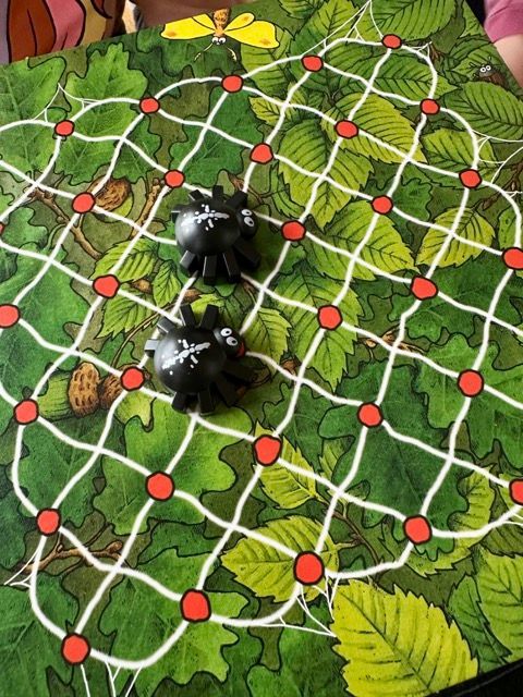 Schon der Aufbau von „Spinderella“ sorgt für leuchtende Augen. Der gesamte Spielkarton wird Teil des Spielfeldes – und das gleich auf zwei Ebenen! Unten wimmeln die Ameisen auf dem Weg zum Ziel, während oben die drei Spinnen – Roberto, Klaus und die Fadenspinne Spinderella sitzen bzw. hängen, um die Ameisen einzufangen. Die Magnetmechanik zwischen den Spinnen oben und Spinderella, die sich an einem Faden abseilt, lädt gleich zu ausgiebigen Tests ein. Es macht Spaß zu sehen, wie sich Spinderella gezielt nach unten bewegt, um den Ameisen das Leben schwer zu machen. Das Spiel an sich ist ein klassisches Wettlaufspiel.
