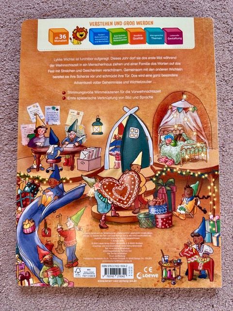 Es ist ein großes, wunderschön gestaltetes Weihnachts-Wimmelbuch, das schon ab etwa einem Jahr funktioniert, aber auch den älteren Kindern noch total viel Freude macht. Die Geschichte dreht sich um Lykke, einen kleinen Wichtel, der in diesem Jahr zum allerersten Mal bei einer Familie einziehen darf. In der Wichtelschule hat sie gelernt, wie wichtig die oberste Wichtelregel ist: Man darf niemals gesehen werden. Wird ein Wichtel entdeckt, verliert er seine Wichtelkraft und das Haus, in dem er gesehen wurde, darf nie wieder von einem Wichtel betreten werden.