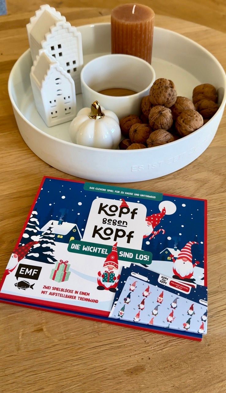 Heute zeige ich euch das perfekte kleine Nikolausgeschenk: Kopf gegen Kopf. Ein Spieleblock für unterwegs, aber genauso gut für zuhause. Mit dabei ist sogar eine kleine Trennwand. Jeder setzt sich auf eine Seite, und dann wird direkt losgespielt. Mal gegeneinander, mal miteinander. Der Block passt in jede Handtasche, ins Bücherregal oder in den Rucksack.