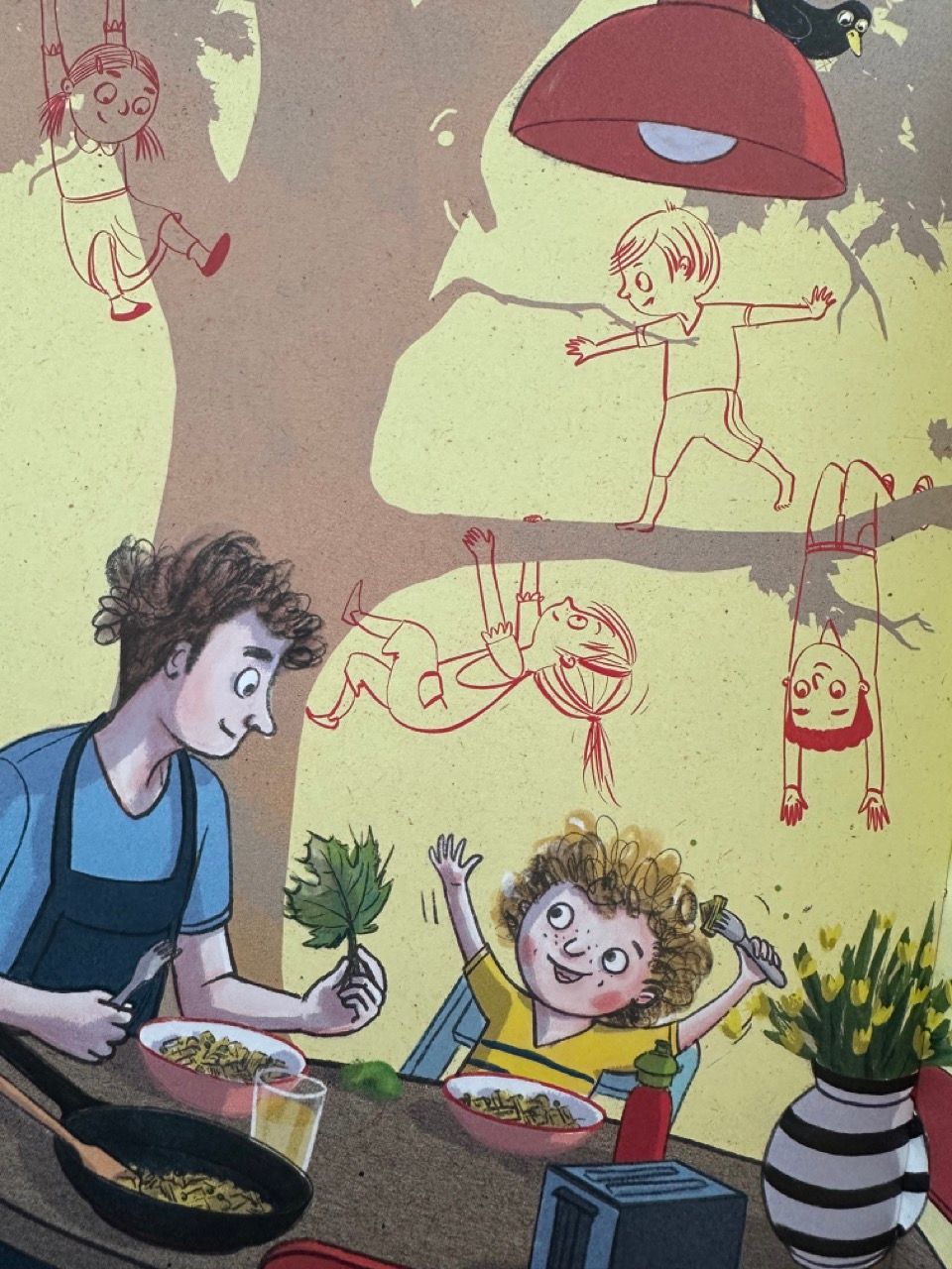 Besonders schön an dem Buch ist, wie genau dieser Moment gezeigt wird. Man ist nicht nur bei Eike im Hier und Jetzt, sondern gleichzeitig auch in seinen Gedanken. Das Buch macht sichtbar, was im Kopf passiert. Die aktuelle Situation und die Erinnerungen an den Tag liegen nebeneinander. Man kann gedanklich und bildlich beides gleichzeitig sehen, genau so, wie Kinder ihren Tag oft noch einmal durchleben.