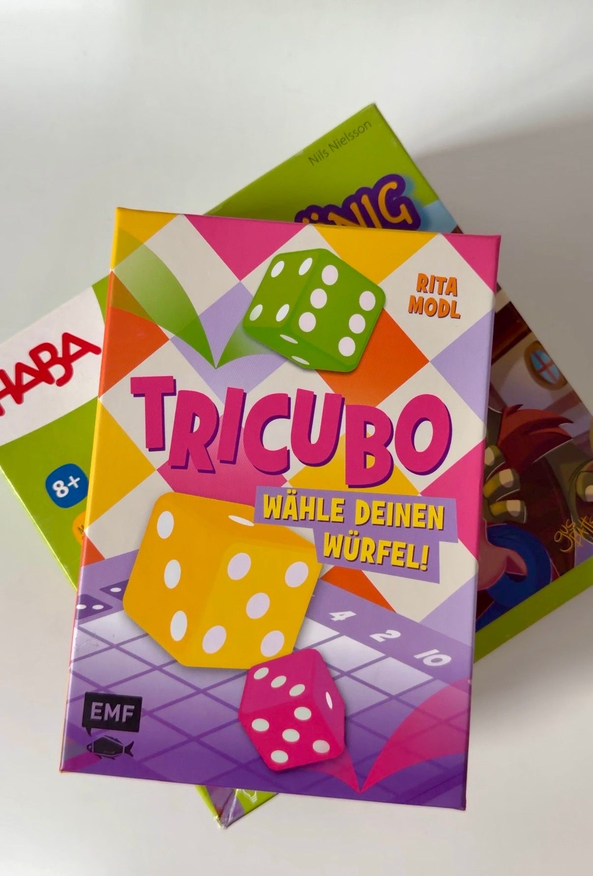 TRICUBO ist bei uns gerade vor allem beim Großen sehr beliebt. Das Spiel ist schnell verstanden und lässt sich auch spontan am Abend noch spielen. Durch die unterschiedlich großen Würfel entscheidet nicht nur die Zahl, sondern auch die Größe darüber, wie viele Kreuze gesetzt werden dürfen.